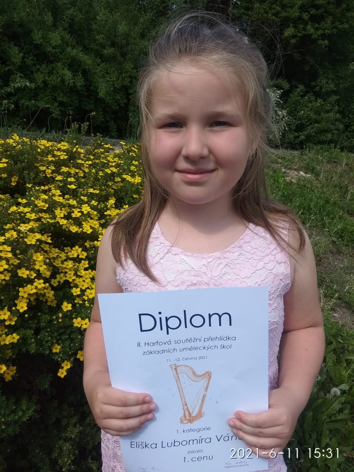 Žákyně naší školy Eliška Lubomíra Váňová získala na II. celostátní harfové soutěžní přehlídce Základních uměleckých škol, konané 11. a 12. června 2021 1. cenu v 1. kategorii. První cenu dostala jako jediná ze své kategorie.