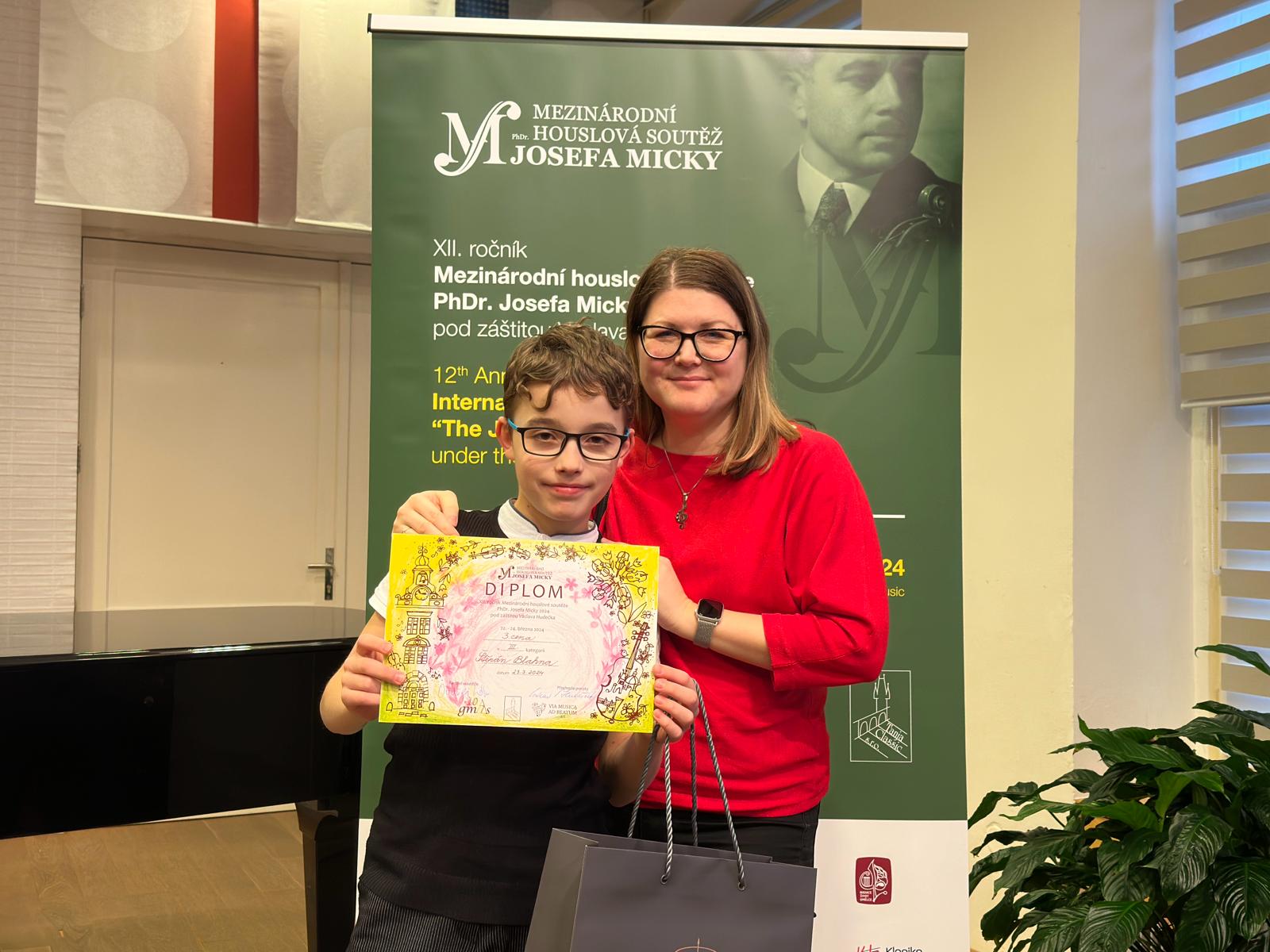 22. - 24. března 2024 se v Praze konal XII. ročník Mezinárodní houslové soutěže PhDr. Josefa Micky. Houslista Štěpán Blahna ze třídy paní učitelky Lenky Podroužkové vybojoval ve veliké konkurenci krásné 3. místo. O vynikající klavírní doprovod se postaral pan ředitel Jan Sedláček. Štěpánovi a paní učitelce moc gratulujeme, přejeme hodně úspěchů v další hudební cestě a děkujeme za výbornou reprezentaci naší školy!