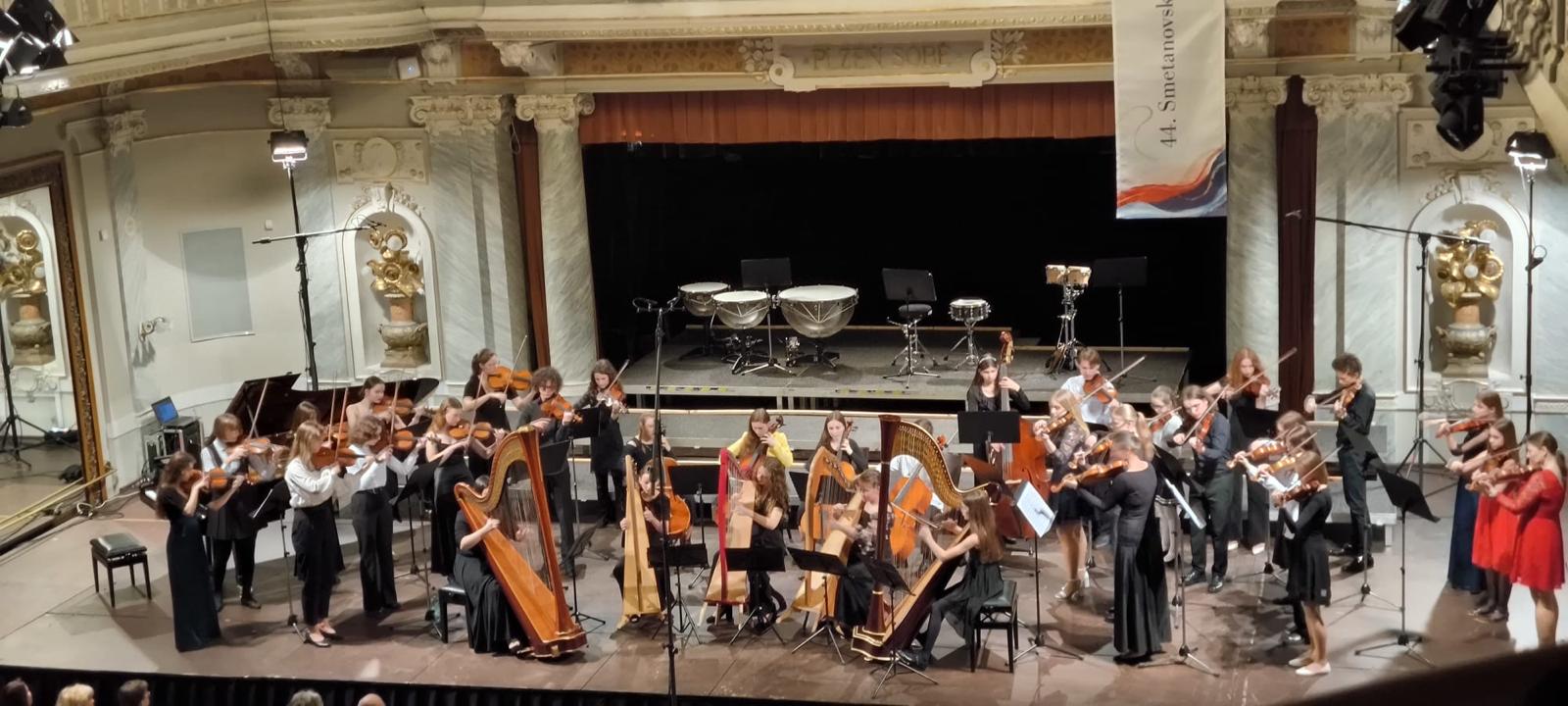V pondělí 11. března 2024 účinkoval náš smyčcový soubor doplněný několika účinkujícími ze ZUŠ Chrást, ve spolupráci se smyčcovým souborem ze ZUŠ B. Smetany v Měšťanské besedě v Plzni. Na krásném koncertě k dvoustému výročí narození Bedřicha Smetany hrál takto spojený orchestr známý repertoár z jeho díla. V jedné úpravě skladby podpořilo smyčcový soubor pět harfenistek a ukolébavku z opery Hubička doplnil i pěvecký sbor.