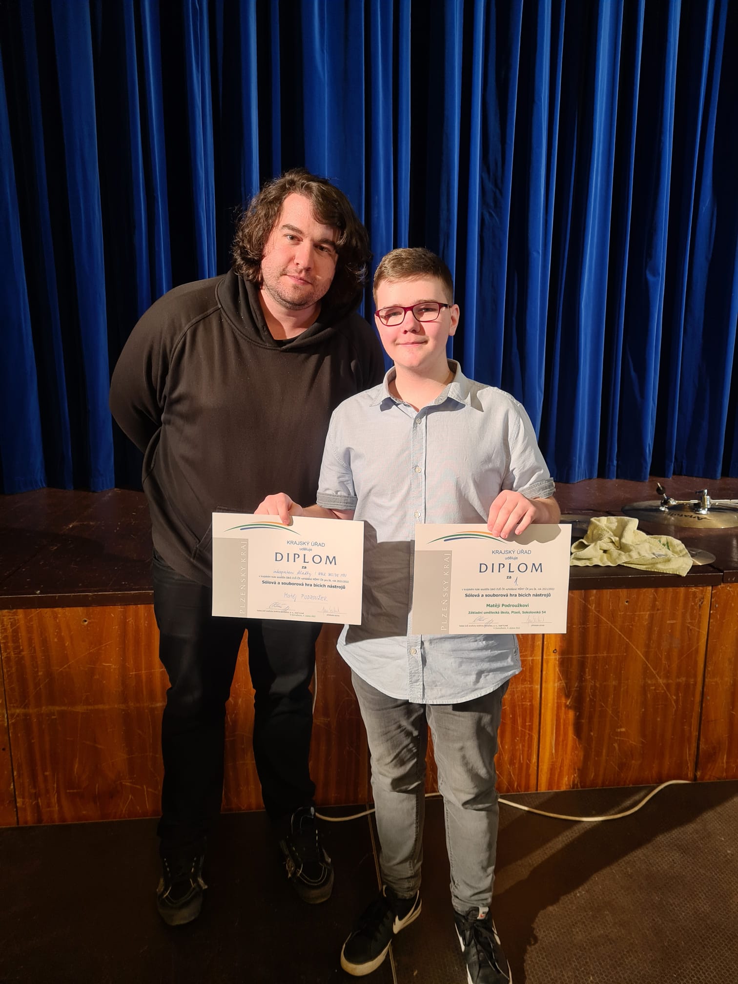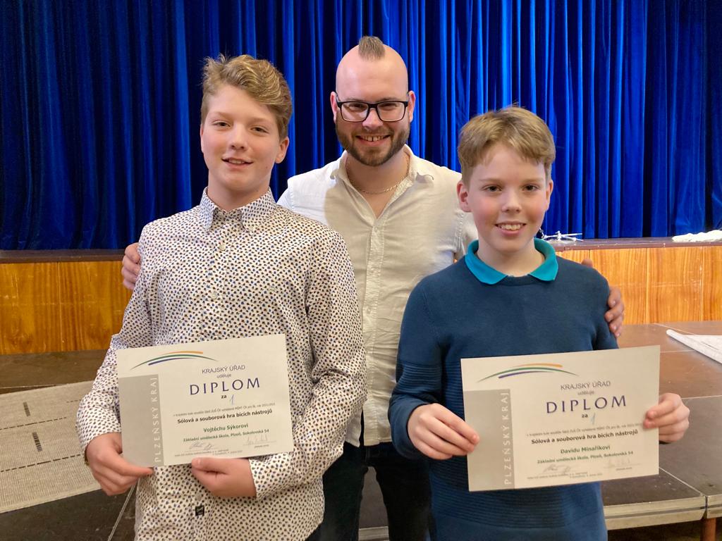 V pondělí 4. 4. 2022 proběhlo v Domažlicích Krajské kolo soutěže sólové a souborové hry bicích nástrojů. Naši ZUŠ zastupovali tři soutěžící v sólové hře na bicí soupravu. Všem žákům, učitelům R. Gaudynovi a L. Švehlovi děkujeme a gratulujeme k vynikajícím výsledkům!