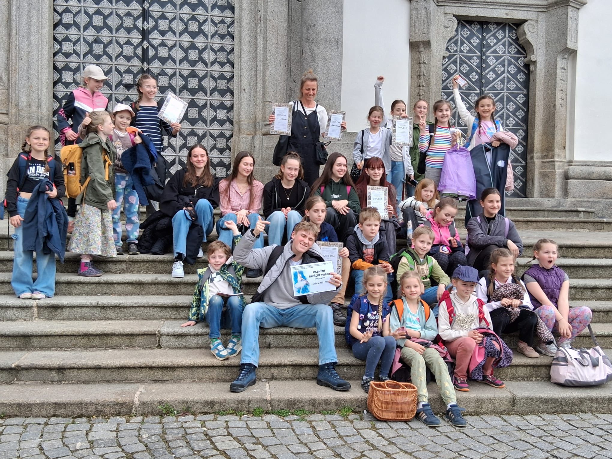 V úterý 15. dubna 2025 se v prostorách Městského divadla Klatovy konala krajská soutěž tanečních oborů. Naši školu reprezentovaly čtyři taneční třídy - Vlaštovičky, Studánky, Chlapecký soubor a Velký soubor. Všichni tanečníci si vedli skvěle a jejich soutěžní choreografie získalytři zlatá pásma a jedno stříbrné. Z Klatov si navíc odvážímepřímý postup do celostátního kola soutěže,návrh na postup,účast na festivalu Smetanova Litomyšla takécenu divácké poroty. Za přípravu všech tanečníků děkujeme paní učitelceSimoně Mikešové, kterábyla porotou oceněna dvěma diplomy za pedagogické vedení k choreografiím "Konvalinky"a "Člověče, nezlob se!". Dále děkujeme panu učiteliJakubu Kotlárovi, kterýdoprovodil tanečníky svou citlivou autorskou hudbou. Velké poděkování patří také všem maminkám, které přispěly k hladkému průběhu soutěžního dne, pomohly s organizací, česáním účesů i výběrem té správné kopečkové zmrzliny pro naše nejmenší. Děkujeme všem a gratulujeme!